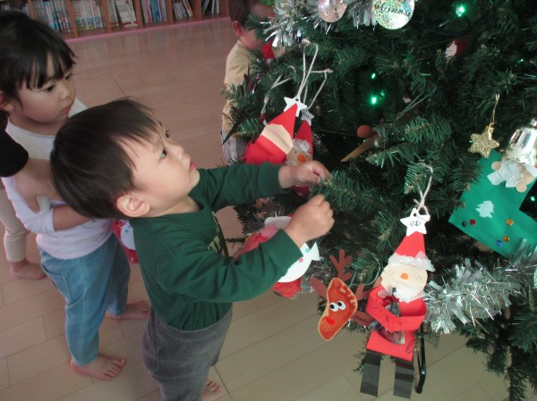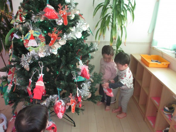 キラキラのライトや大きなクリスマスツリーで保育園もクリスマスの雰囲気で賑やかになっています。
