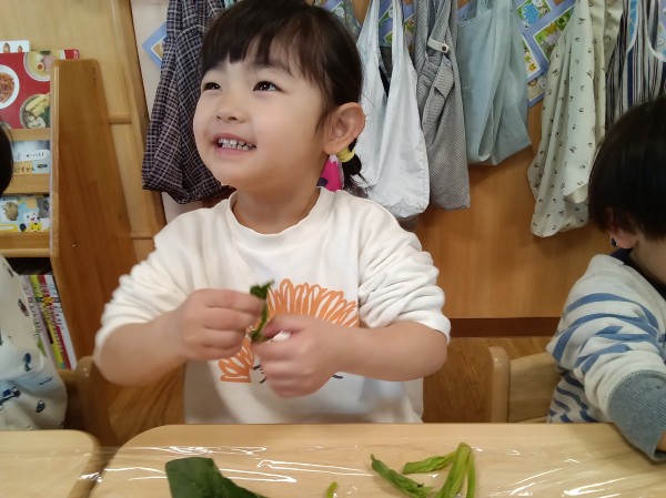 ちぎったときの音を聞いたりと楽しみました。給食に出てくると、興味深かそうに見つめる姿も印象的でした。