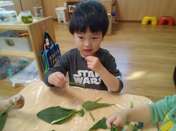 子どもたちは栄養士からほうれん草を手渡され、葉や茎の部分を見たり触って匂いを嗅いだり