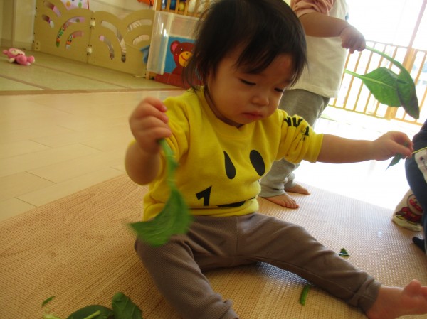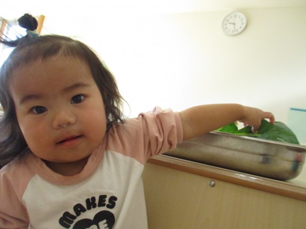 こどもの家・志木中宗岡 1月の食育 「小松菜に触れる☆彡」 たまご組(0歳児)