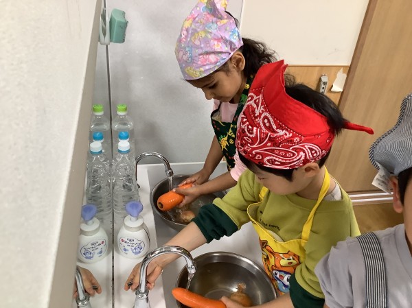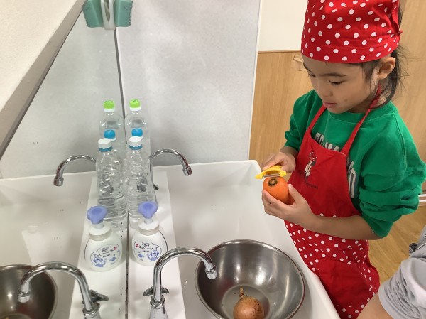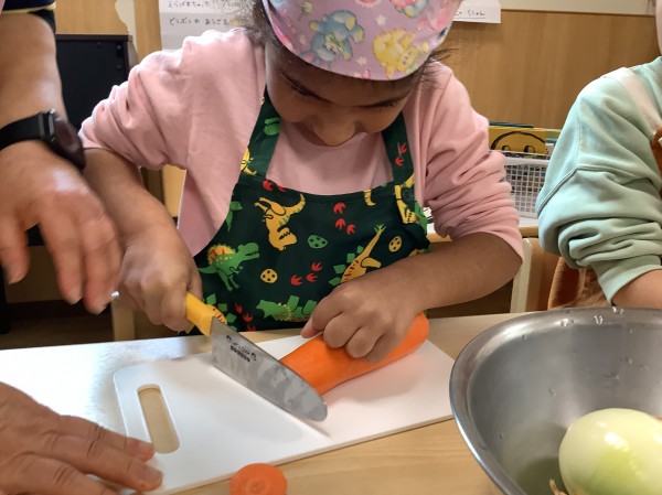 今日は、食育がありカレーを作りました。開始時間前に自分たちで協力しながら、エプロン・三角巾を準備していたぞう組の子どもたち。給食の先生が入ってくると「今日は、カレー作るんでしょ?」「はやく作りた~い!」と話していました。