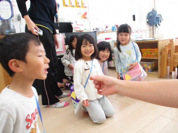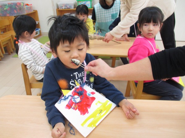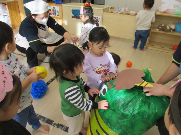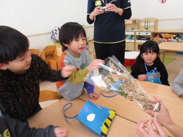 幼児組さんでは鬼の嫌いな柊のチクチクを触って、 鰯の匂いを体験してもらいました。