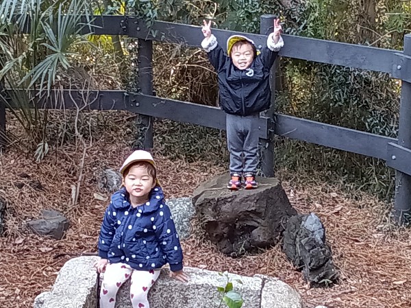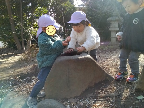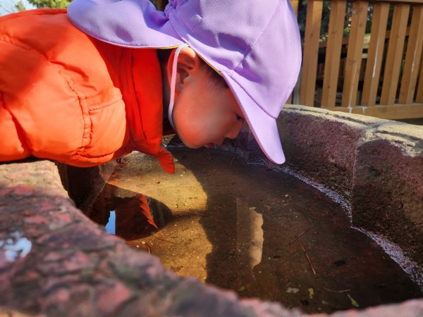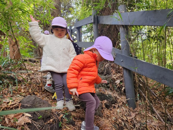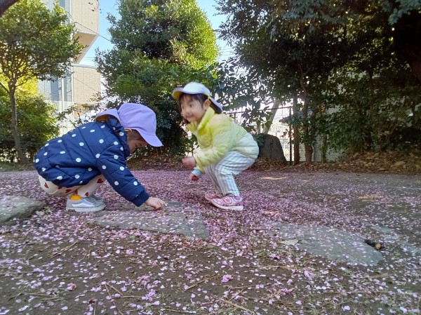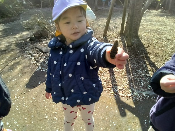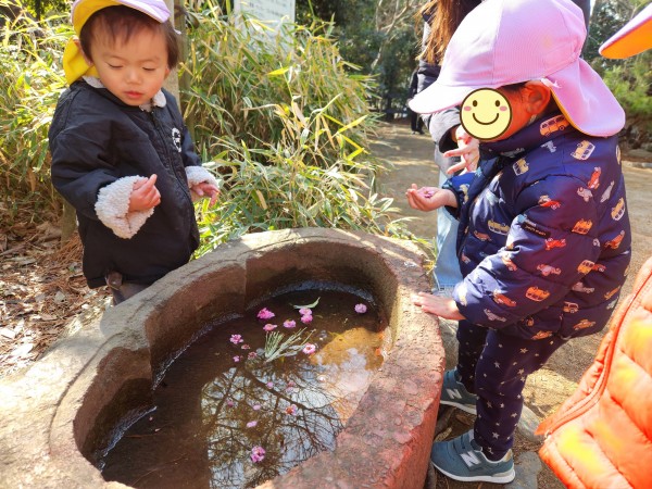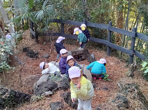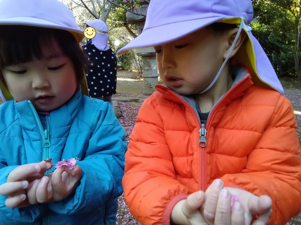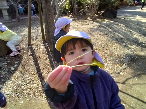 今日は緑地がある公園に行ってきました。保育参加の保護者もいらしたのでいつもよりも楽しそうな子どもたちでした。駅では静かに歩くこと、お友だちの後ろについて歩くことなど散歩のお約束事をしっかりと守って行くことが出来ました。公園では梅の花が咲いていて「じゅうたんみたいだね!」「白とピンクがあるよ!」とお花摘みに夢中になっていました。他にも木の実や松の葉を拾ってお家ごっこをしたり、垣根の間を潜って「探検するぞー!」と意気込んで何回も往復して楽しんでいました。帰り道に「ちゃんと足を上げて歩くんだよね。じゃないと転んじゃう。」と歩き方を確認しながら元気いっぱいに帰ってきました。