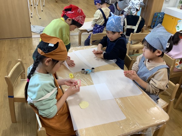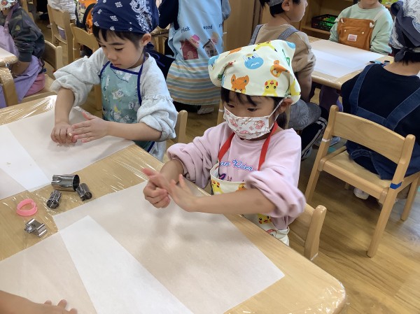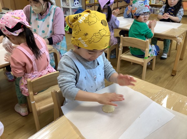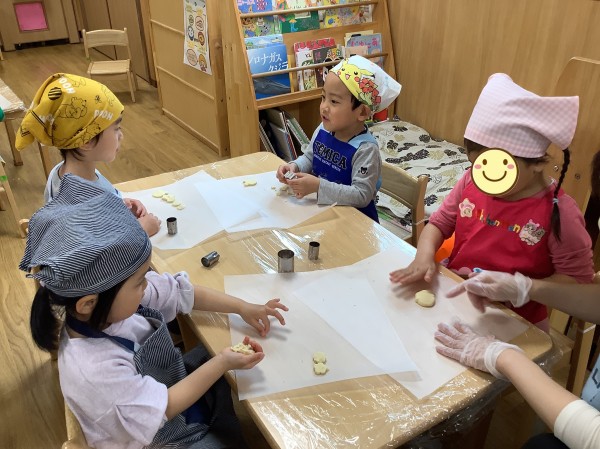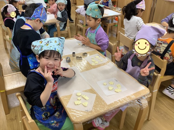 今日は食育で【バレンタインクッキー作り】がありました。朝から楽しみにしていた子どもたち。玩具の片づけ等もいつもよりも早く行うことができました。エプロン、三角巾をつけた後は、【あわあわ手洗いのうた】に合わせて丁寧に手洗いをし、準備万端。給食の先生の話をしっかりと聞き、いざクッキー作りスタートです。今日はクッキーの生地を手で広げ伸ばし、好きな形の型抜き器を使って型抜きをしていきます。一人三つくらい作れる量の生地をもらったのですが、「たくさん作りたい」と生地を薄く薄く伸ばすお友だちが多かったです。ハートはお花の他、車やクマ等の形もあり、嬉しそうにしていた子ども達。「こっちに車あるよ」「ハート貸して欲しい」と互いに声を掛け合いながら型抜き器を貸し借りし、いろいろな形のクッキーを作っていました。今日作ったクッキーはおやつの時に食べる予定です。クッキー作りの後は、公園に行き身体を動かして遊びました。