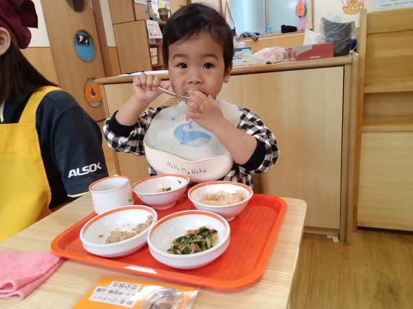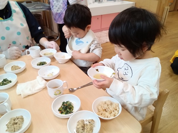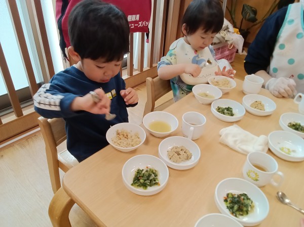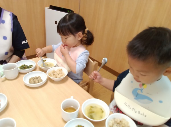食育活動を行いました。乾燥わかめに触れる活動に参加した子どもたち。小さくて硬い乾燥わかめを持ったり、匂いを確かめていました。ぬるま湯をカップに注いで、しばらく様子を見ているとわかめがふやけてきました。保育者に知らせてもらいながら、形の変化に気づいたり、磯の香りがしてきて何度も匂いを確かめていた子どもたちです。カップを持って、お湯の中で揺れるわかめを見て、「海?」「海みたい」と呟く姿がありました。昨日数分間だけ、わかめの映像を見ていたことを思い出したようでした。子どもたちの記憶力に驚かされた場面でした。給食で、わかめの味噌汁が用意されると、食育活動をしたことを思い出してわかめを食べたり、触って感触を楽しんでいました。