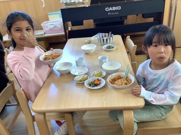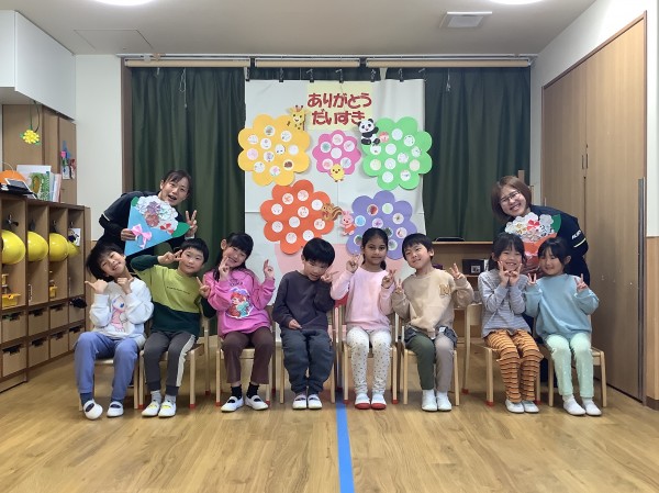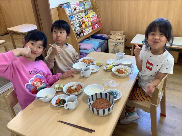卒園式の練習のあと、「お別れ会」に参加しました。ぞう組のみんなが入園した当初からの写真のスライドを使って「これは誰でしょう?」クイズをしました。みんな面影が残っていて、みごと全員正解でした。ひよこ、りす、うさぎ、ぱんだ、きりん組からかわいいお花のメッセージのプレゼントがありました。(階段に掲示しますので、ぜひご覧ください!)最後にみんなで「世界がひとつになるまで」の歌を大合唱しました。みんなで元気いっぱい歌いました。そして、給食はぞう組の「リクエストメニュー」の日でした。「やった!今日は、リクエストメニューだ!」「おかわりあるかな。」と楽しみにしていた子ども達。今日おかわりをする子もたくさんいて、もりもり食べていた子どもたちでした。