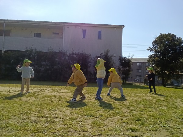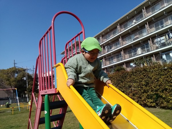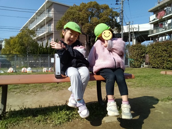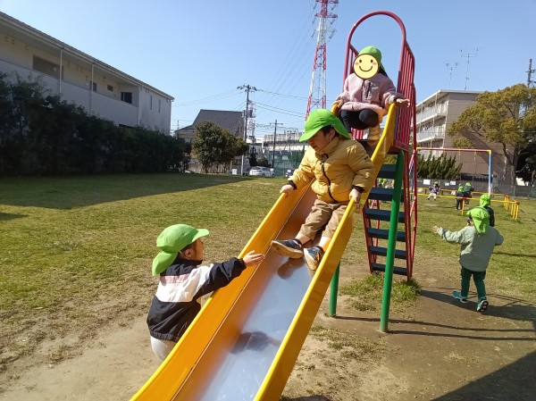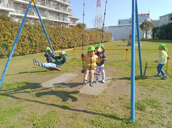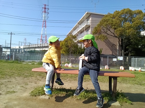 今日はぱんだ組だけで公園へ散歩に行きました。「今日はぱんだ組だけだよ」と伝えると「やった!」「よっしゃー!」と大喜びでした。準備もスムーズで早々に保育園を出発しました。公園では鬼ごっこをしたり、ブランコ、滑り台の遊具で遊びました。「一緒に遊ぼう」「入れて」など自分たちで声を掛け合って友だち同士仲良く遊ぶ姿が見られました。