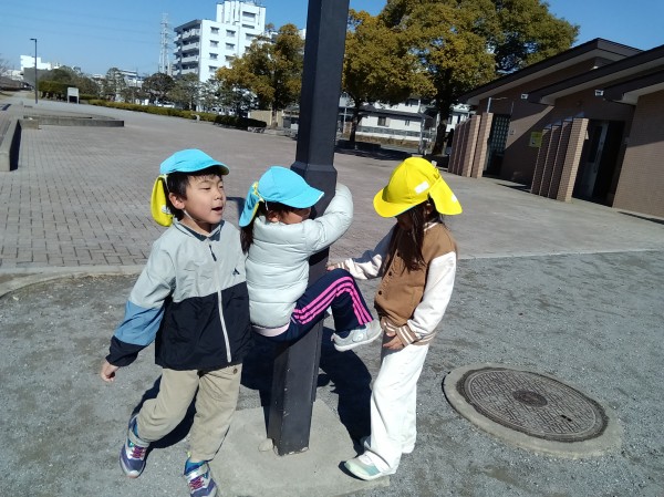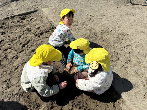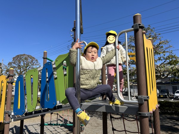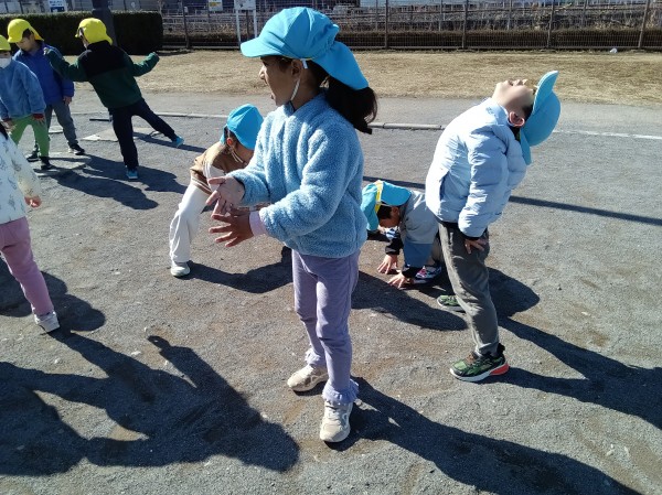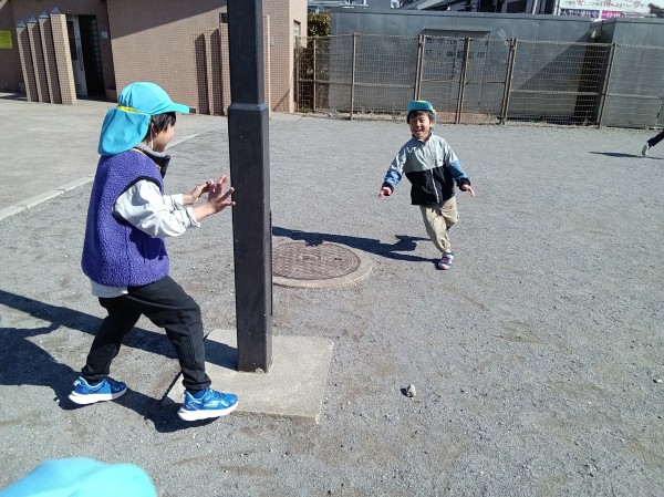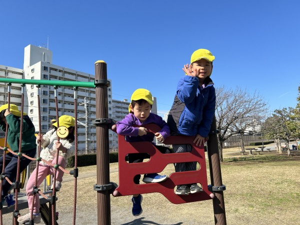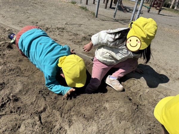 今日は、ぞう組ときりん組で公園に行ってきました。昨日とは打って変わって、太陽の力でポカポカ陽気でとても気持ちよさそうにしていました。公園に着いて、恒例の2分間マラソンをした後、きりん組は遊具の方へ、ぞう組は広場の方へ一直線。自然とクラスでわかれて遊び始めました。大きな遊具の方は、昨日の雨の影響で水溜まりがあったり、遊具が濡れている箇所があったりしたのですが、子ども達同士で「ここ濡れてるから気を付けて」等と声を掛け合って遊ぶ姿が見られました。ぞう組はケイドロをしました。「警察は何人にする?」「じゃぁ、グーとパーで決めよう!」「ドロボウチーム集まって!作戦タイムしよう!」などと子どもたちで話をしながら楽しむ様子が見られました。誰かが転ぶと「大丈夫?」と駆け寄り、砂をはらう優しい姿もみられてほっこりしました。しばらく遊んだ後、ぞう組は、卒園式の練習の為、一足お先に帰園。「頑張ってね~」と見送った後、きりん組は砂場に行き遊び始めました。膝が埋まってしまう程深く穴を掘ったり、山を作ったりして楽しみました。