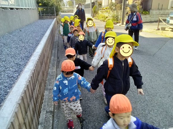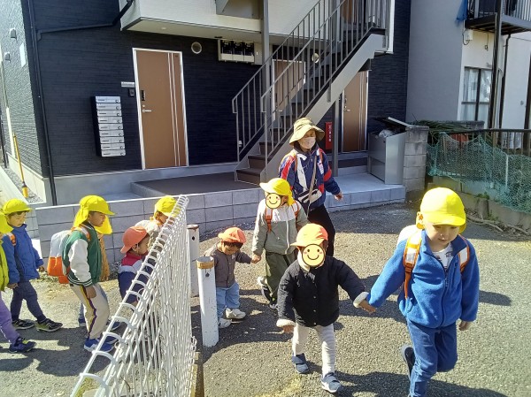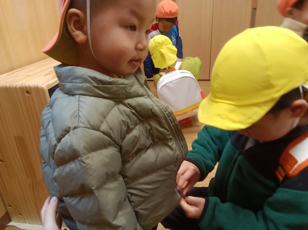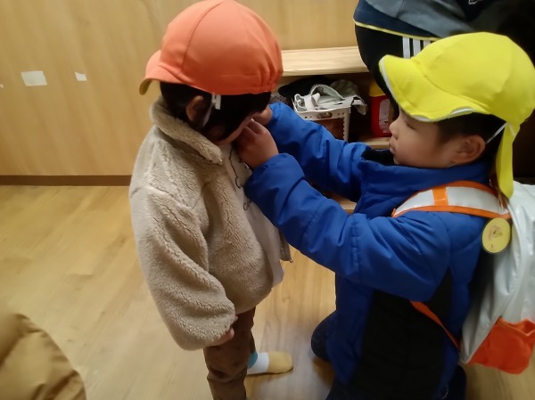 今日は、今年度初めて、きりん組とりす組合同でお散歩に行ってきました。お互いにまだ慣れていないので、まずはりす組の部屋で一緒に遊びます。最初はどうやって関わればいいのかわからず戸惑うきりん組さん、人見知りをしてしまっているりす組さんでしたが、おままごとやブロックを通して、少しずつ距離が縮まっていきました。いよいよ、散歩に出発。その前に散歩準備をします。「手伝ってあげようか?」と優しく声をかけるきりん組に対して、身を任せるりす組さん。無事に準備が終わるととても嬉しそうにしていました。今日は、園周辺を歩くお散歩でしたが、お兄さん、お姉さんとして優しくリードしていました。りす組さんも、座り込んだりイヤイヤしてしまうことなく、頑張って歩くことができました。