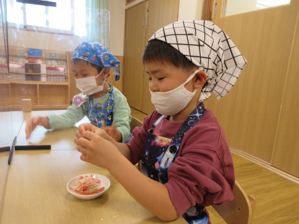 3歳児ぱんだ組はドレッシング作り、4歳児きりん組はレタスちぎりとカニカマ割き、5歳児ぞう組はキュウリを包丁で切りました。
