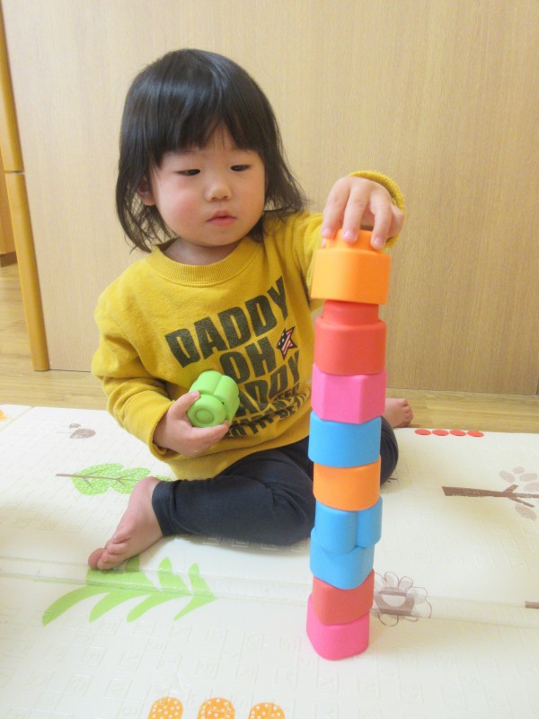 積み重ねたり、型はめしたりと日々お気に入りの遊びを見つけて夢中で楽しんでいます。