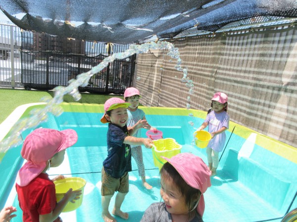 夏らしい厳しい暑さが感じられる今日この頃。3,4,5歳児幼児組のプール開きを行いました。