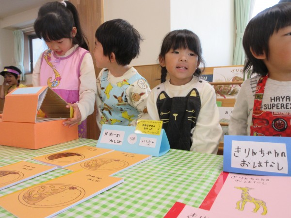 3・4・5歳児はお店屋さんごっこを行うことで、商品を作る苦労や商品を売り込む工夫、お金のやり取り等を遊びを通して学ぶことが出来ました。