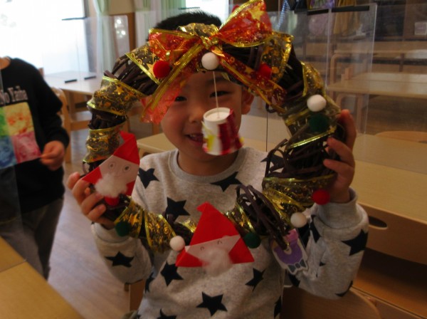 クリスマスへ向け、今年も4・5歳児の芋掘り遠足の際に頂いた芋づるを利用してクリスマスリースを作りました。