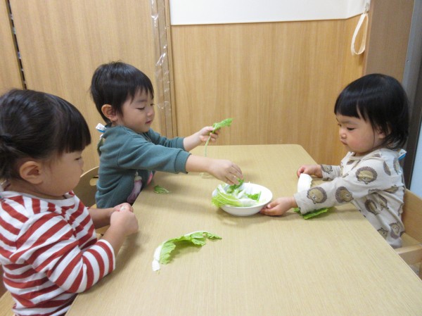 今回は1歳児りす組の白菜ちぎり、2歳児うさぎ組のかぶ洗いの様子をお伝え致します。