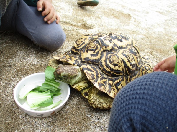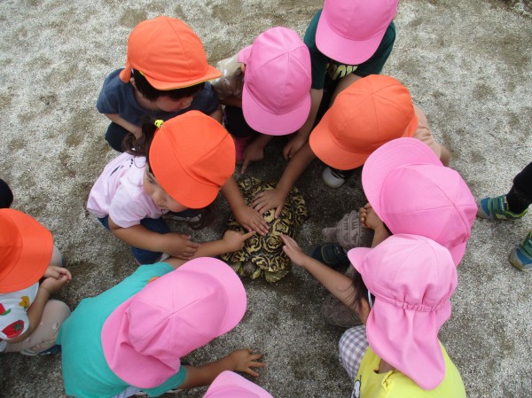 今日は、カメのカー君が保育園に遊びに来てくれました。初めは離れたところから様子を伺っていた子ども達も、気付いたらカー君の甲羅をナデナデ‥