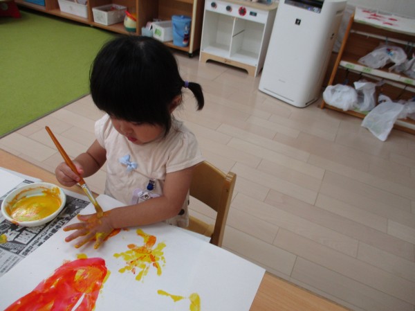 毎日暑いですね。暑い日は室内で過ごしています。今日は、室内で絵の具遊びをした時の様子をお知らせします。