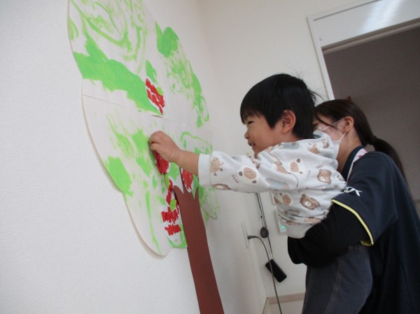 先日、初めてハサミを使った製作を行ったらっこ組。今回は、ハサミを使ってりんごを作った子どもたちの様子をお届けします(^^♪
