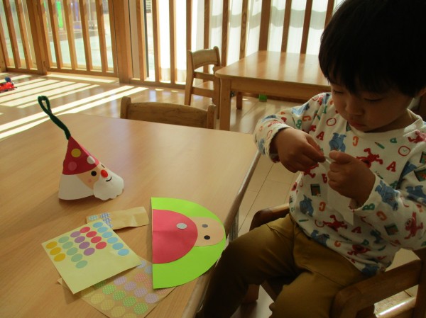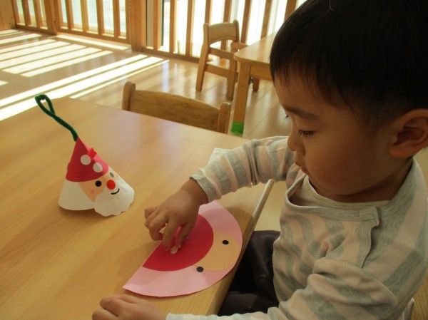 オーナメントはサンタさんをモチーフにパーツをシールで貼りしました。シールが上手くはがれなかったり、貼ったと思ったら指にくっついたりといろいろ苦戦していましたが、一生懸命貼っていました。
