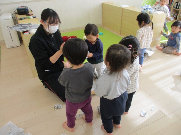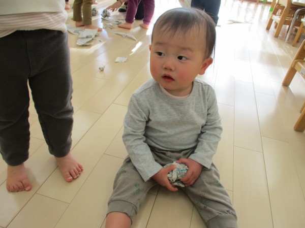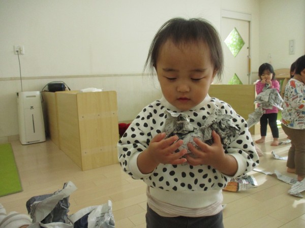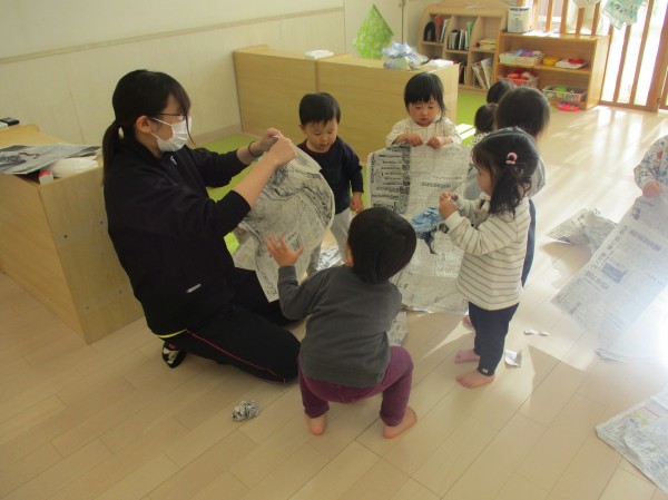 こどもの家・志木中宗岡 新聞紙遊びをしたよ(^^) あひる組(1歳児クラス)