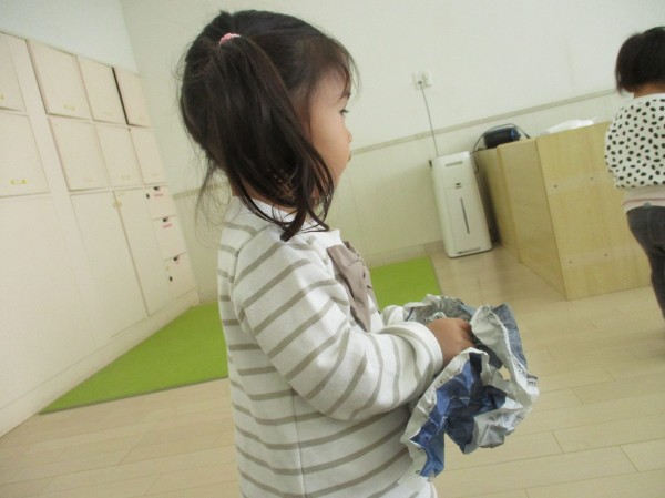 お部屋で保育者が新聞紙を並べて敷いていると、「なになに?('ω')」と興味津々で集まってきた子ども達。