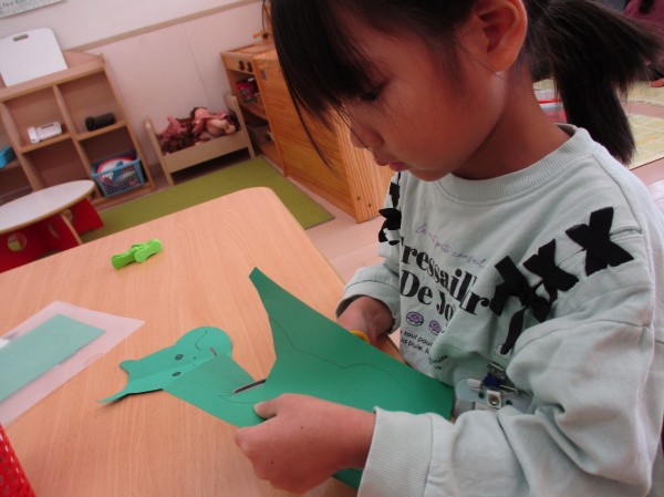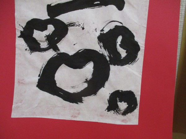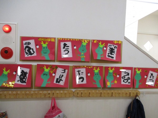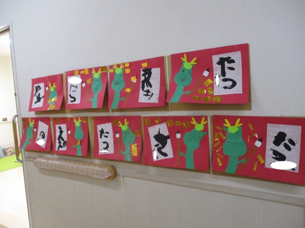 画用紙で辰を作り、その隣には半紙・墨汁・筆を使って書き初めごっこをしました(^^♪