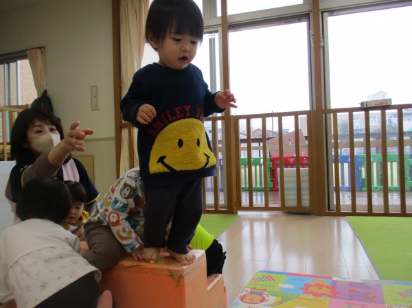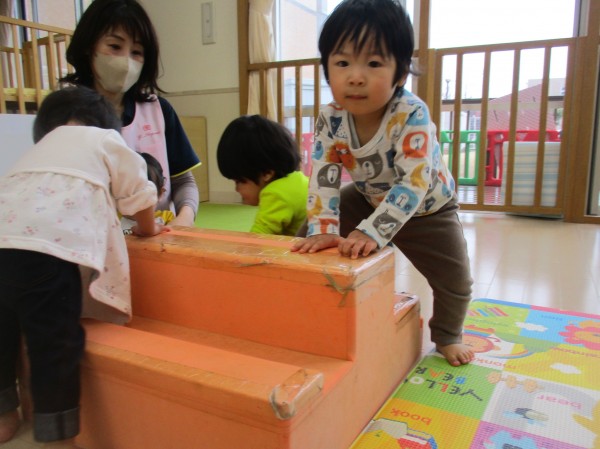 階段型のものにたくましくハイハイで登ったり、高い所に立ち上がったり、保育者の胸に飛び込むようにダイブする子も。