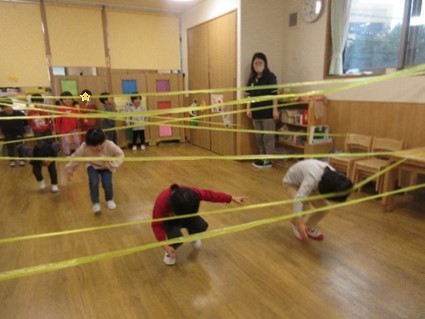スズランテープにたくさんの洗濯ばさみをくっつけ、高いところは背伸びをしながら、低いところは寝転びながらと態勢を工夫しながら楽しんでいました。スズランテープに当たらないようまたいだりくぐったりしながらゴールし大喜びの子どもたち。