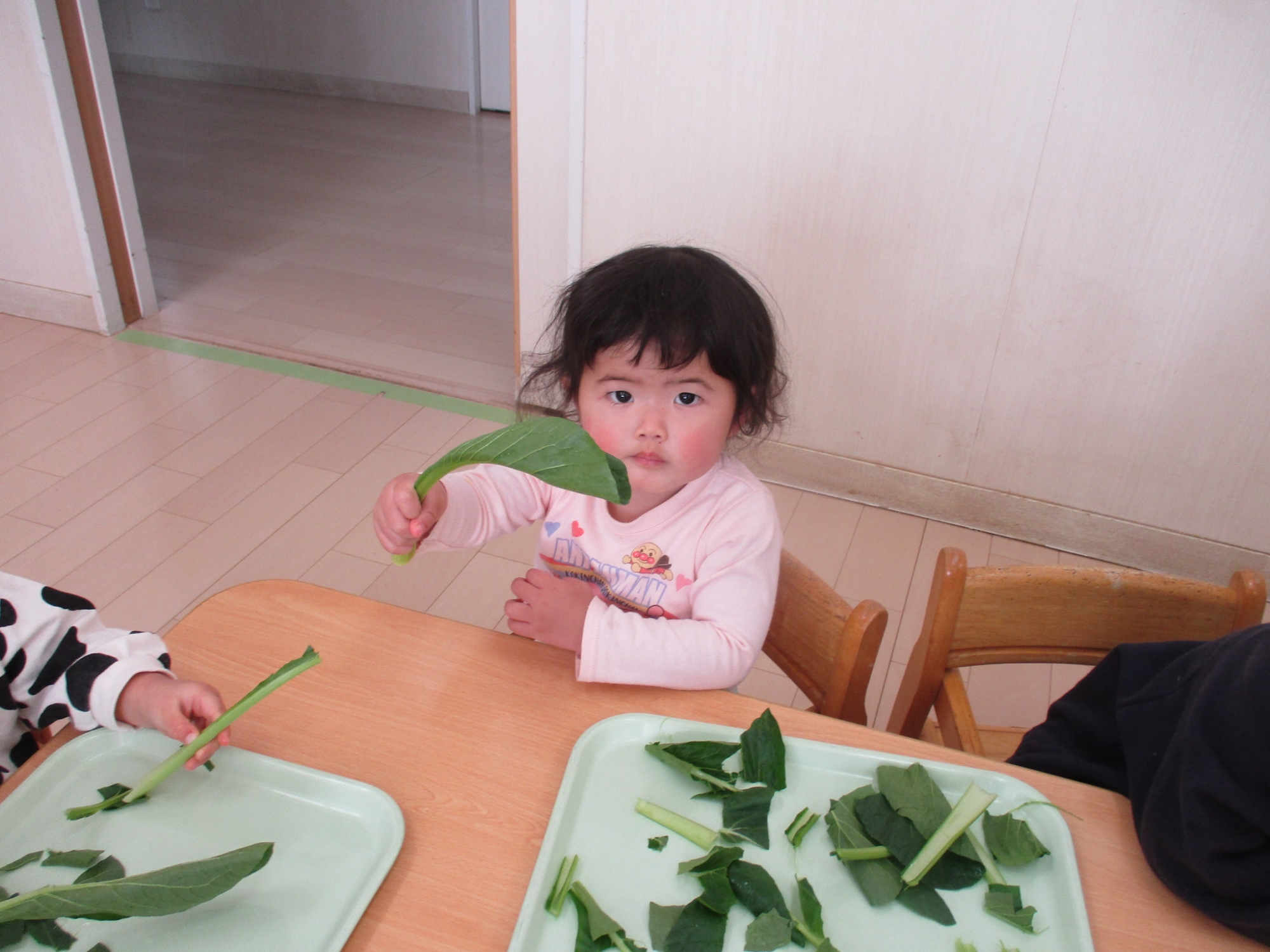 こどもの家・志木中宗岡 食育☆小松菜ちぎり あひる組(1歳)