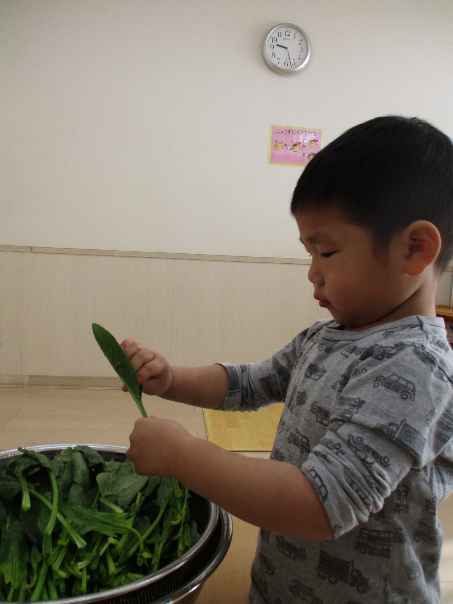 こどもの家・志木中宗岡 ほうれん草ちぎりをしたよ!(ぺんぎん組:3歳児クラス)