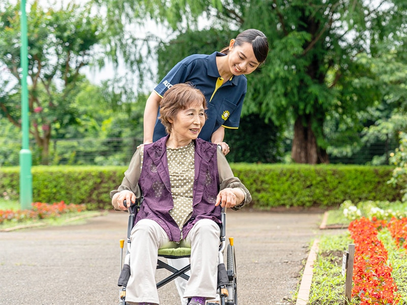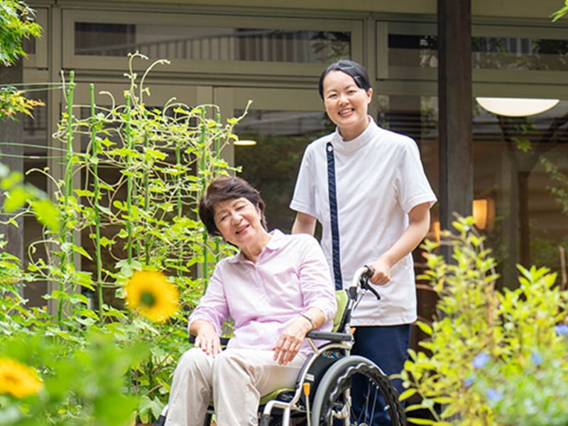 天気がいい日は外の空気を吸って気分転換したり、花や植物を眺め季節を感じていただくお散歩のサポートをします。