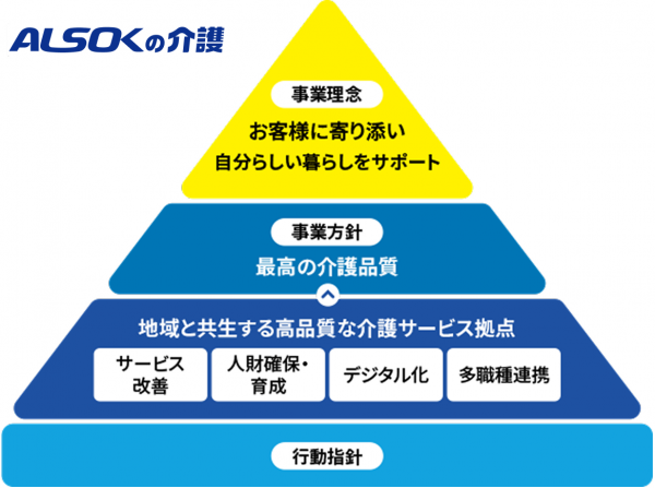 “『ALSOKの介護』は、一人ひとりのお客様に誠実に寄り添い、お客様の自分らしい暮らしをサポートすることで、お客様から確かな信頼を得るとともに、社会の負託に応えてまいります。”