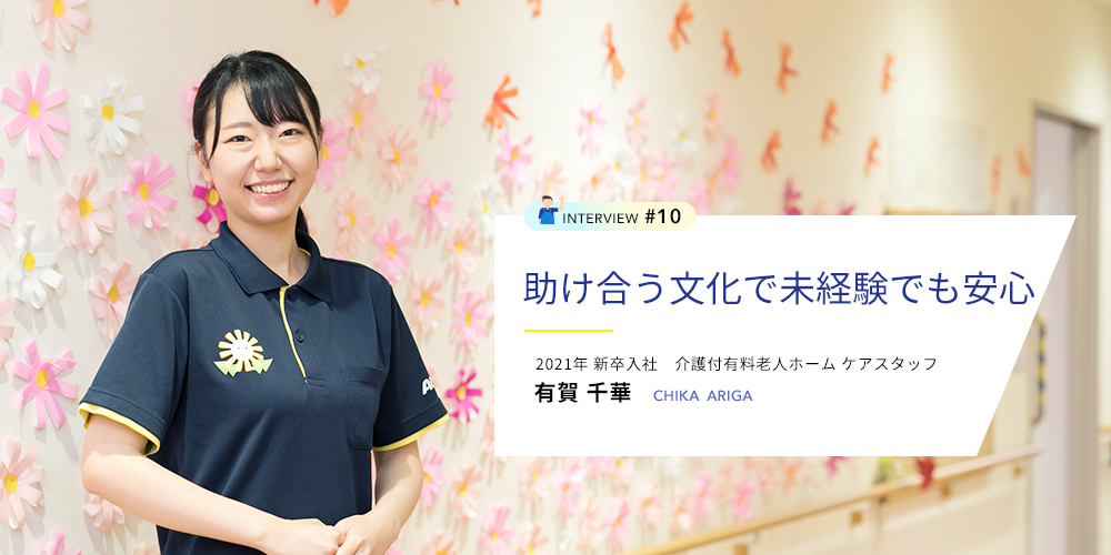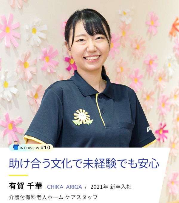 2021年に入社し、介護付有料老人ホーム アミカの郷流山でスタッフとして働いています。仕事はご利用者様の日々の生活のサポートです。食事・風呂・排泄など、ご利用者様ができないことをお手伝いしています。