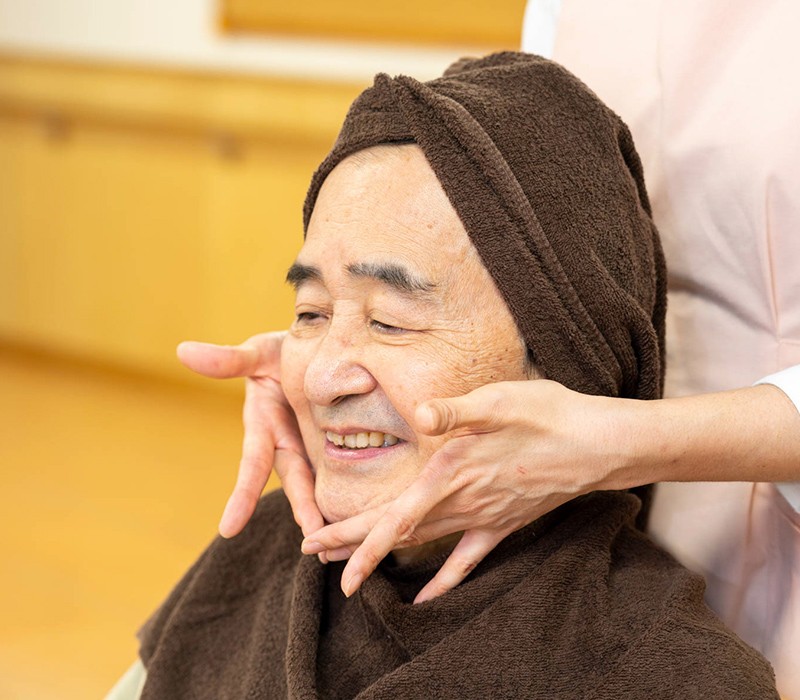 シニアセラピーは、「ご利用者様に毎日をいきいきと過ごしていただきたい」という願いを込めてスタートした、オリジナルの癒しのサービスです。高齢者向けにアレンジした「リンパドレナージュ」により、足や顔に心地よい刺激を与え、『心と身体の両面』の健康を目的としています。