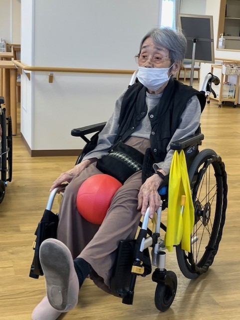 しっかりとチューブとボールを操り、下肢筋力をつける運動を行っています!