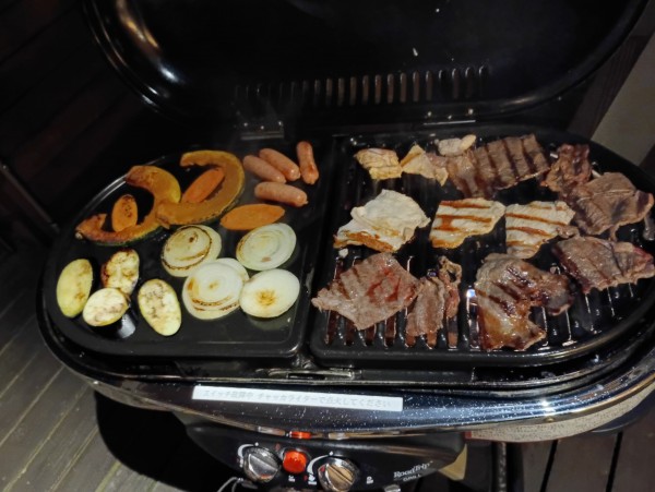 夕食はテラスでバーベキュー、すごいボリュームです。